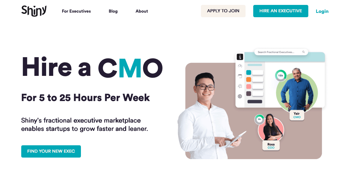 Shiny is a fractional executive marketplace that includes recruiting roles among its C-level offerings. The service connects startups with fractional VP of Talent and Head of Recruiting executives who provide strategic leadership instead of hands-on recruiting work.