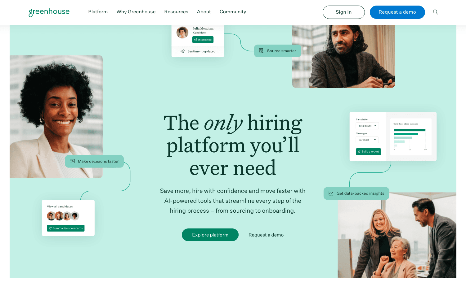Greenhouse added AI features in recent updates, including interview question suggestions, job description generators, and sentiment analysis tools. These features support recruiters by surfacing insights and reducing prep time. Greenhouse frames their AI as augmenting human decision-making, which fits teams with trained recruiters who want data to inform their process.