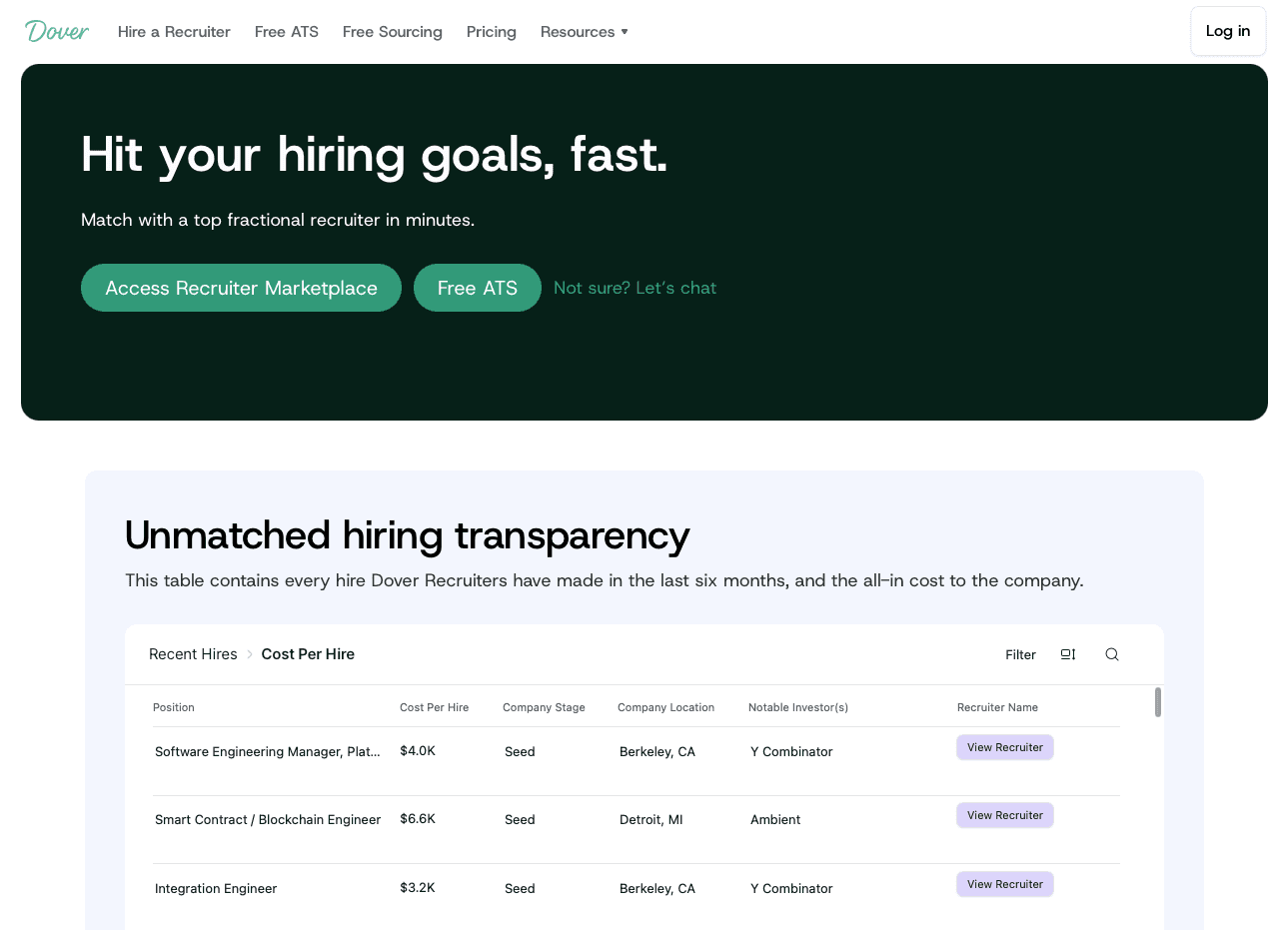 Dover is a recruiting solution that pairs a free ATS with a marketplace of vetted recruiters. The company targets early-stage and growing startups that need both software and recruiting help without the overhead of full-time hires or agency retainers.