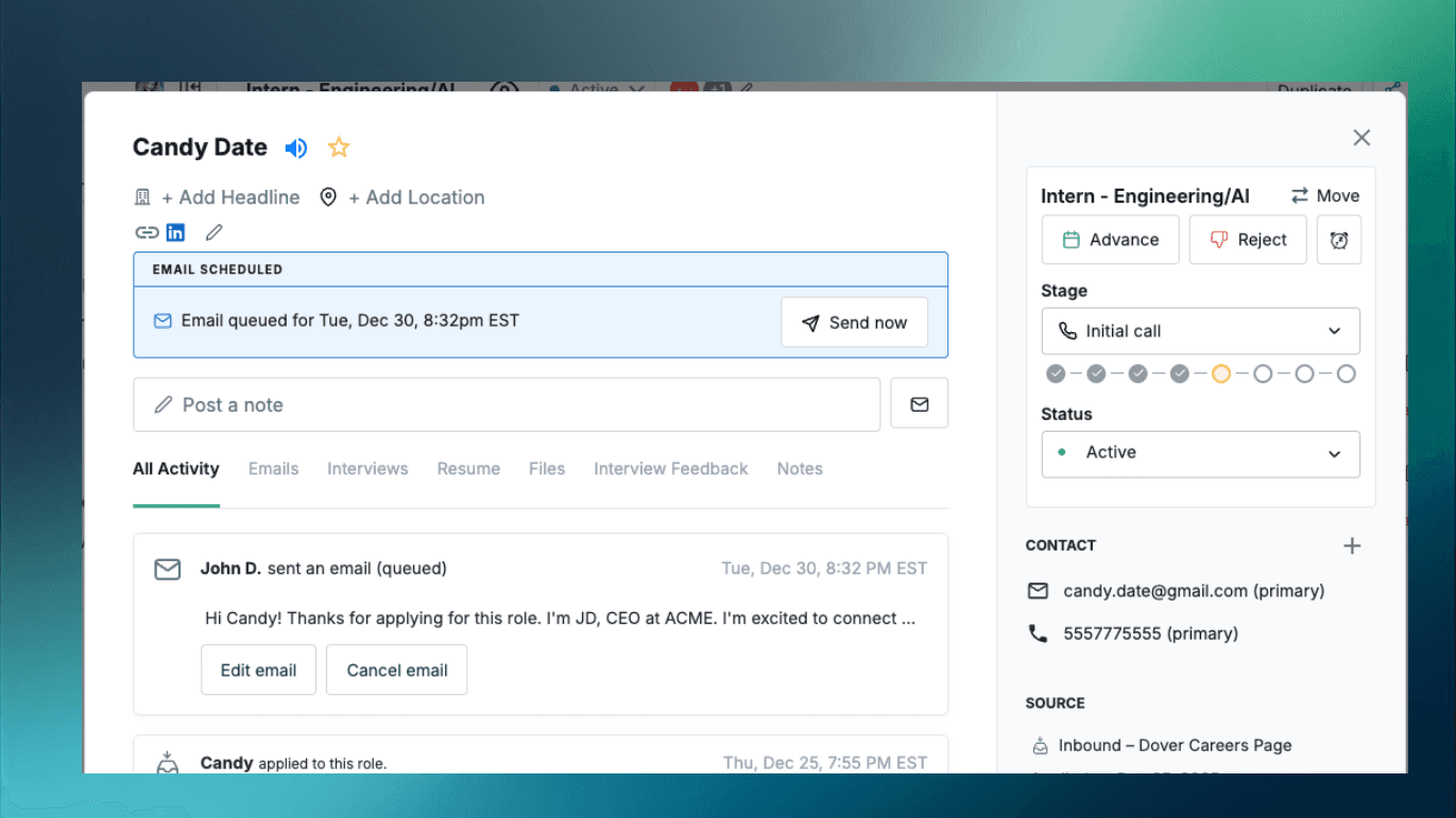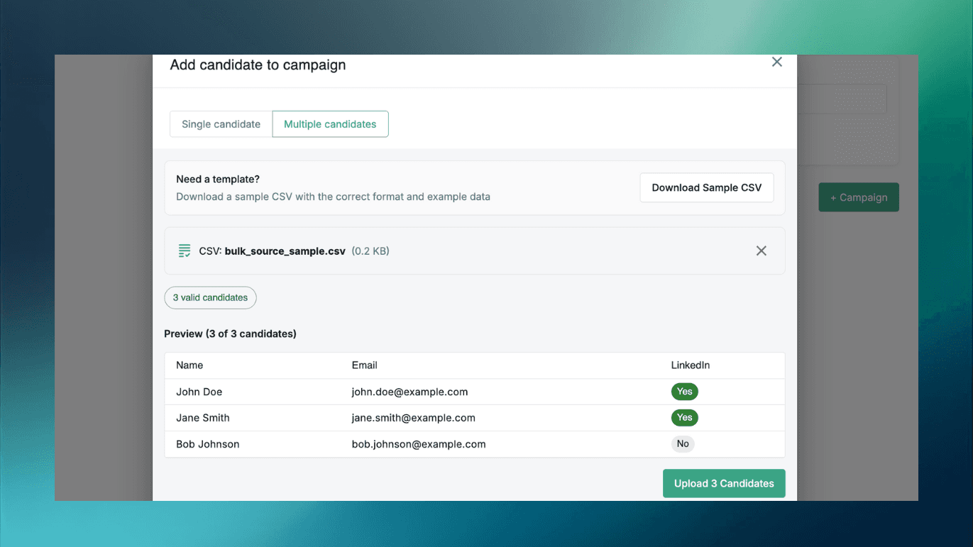 Got a list of candidates you want to contact? You can now send outreach to multiple candidates at once, making it dramatically faster to contact stellar candidates. Simply select an outreach campaign, upload a CSV, and candidates will automatically be added to the email sequence.