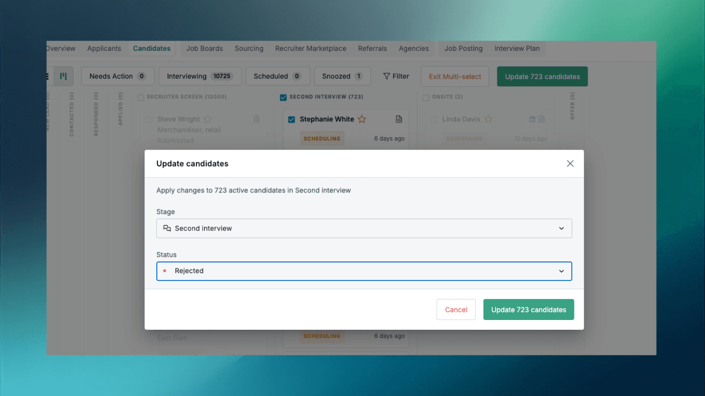 Multi-select candidates and update interview stages and statuses in bulk. Reject a batch of candidates or move candidates forward in the interview process, all with a couple clicks.