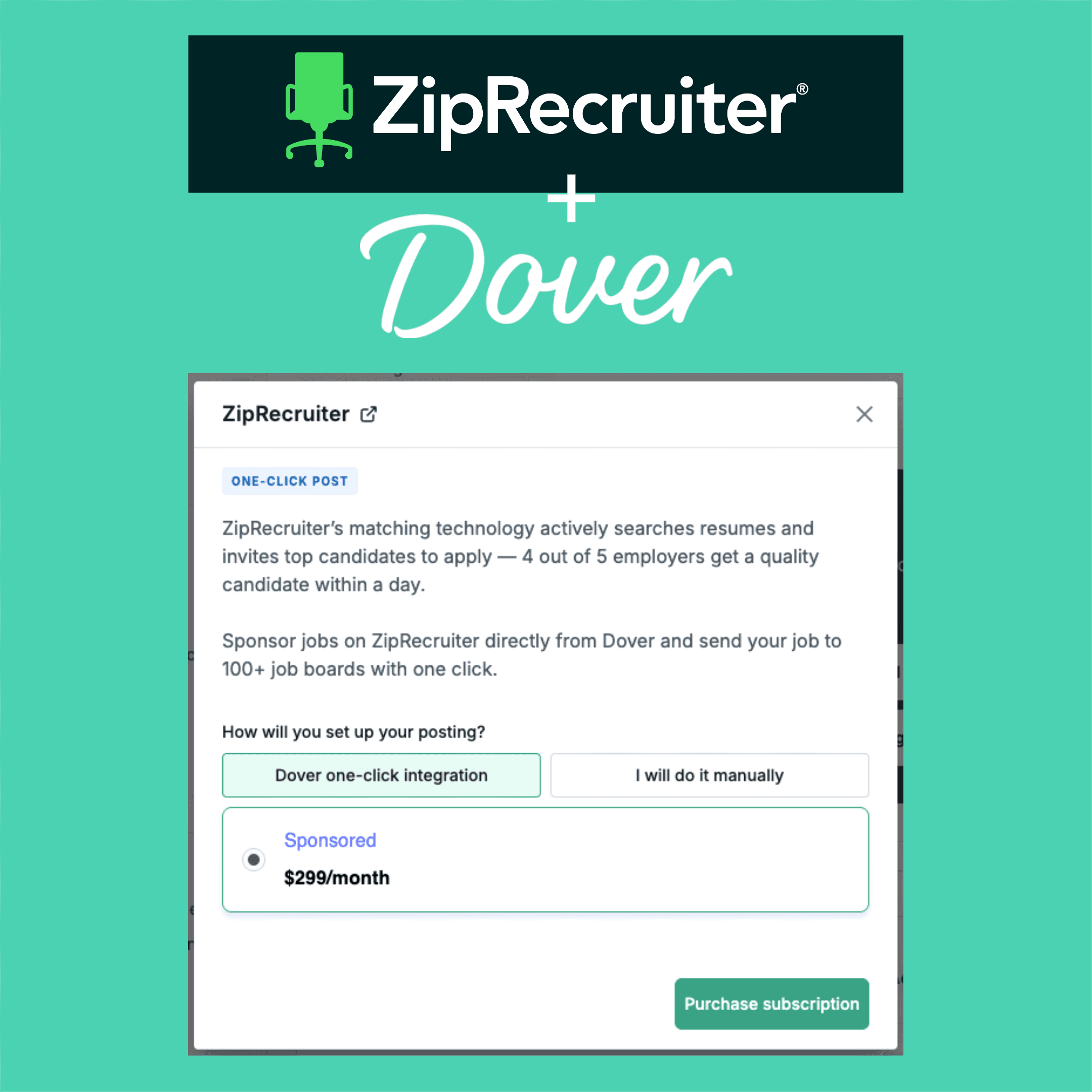 We partnered with ZipRecruiter to help you get more visibility for your job postings. Now you can sponsor jobs on ZipRecruiter directly from Dover for $299/month per job and send your job to 100+ job boards with one click.
