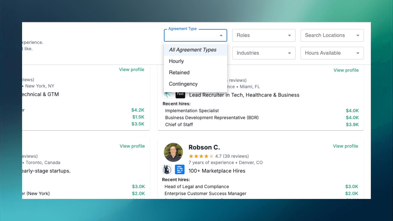 Check out the Marketplace to filter recruiters by agreement type: hourly, retained, or contingency.